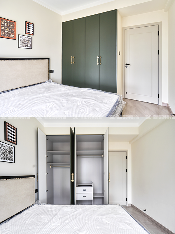 門墻柜一體,臥室根據喜好和需求用煙熏尤加利+象牙灰和墨綠色搭配,獨特又有個性;三個臥室都做了充足的衣柜收納,?掛衣區、疊衣區、被褥區、小件區……整潔有條理!