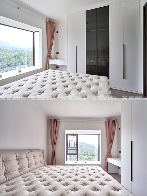 定制:柜體18厚杉木芯板,煙熏尤加利;柜門PET膚感琥珀白。包含百隆五金+掛衣桿+抽屜等。