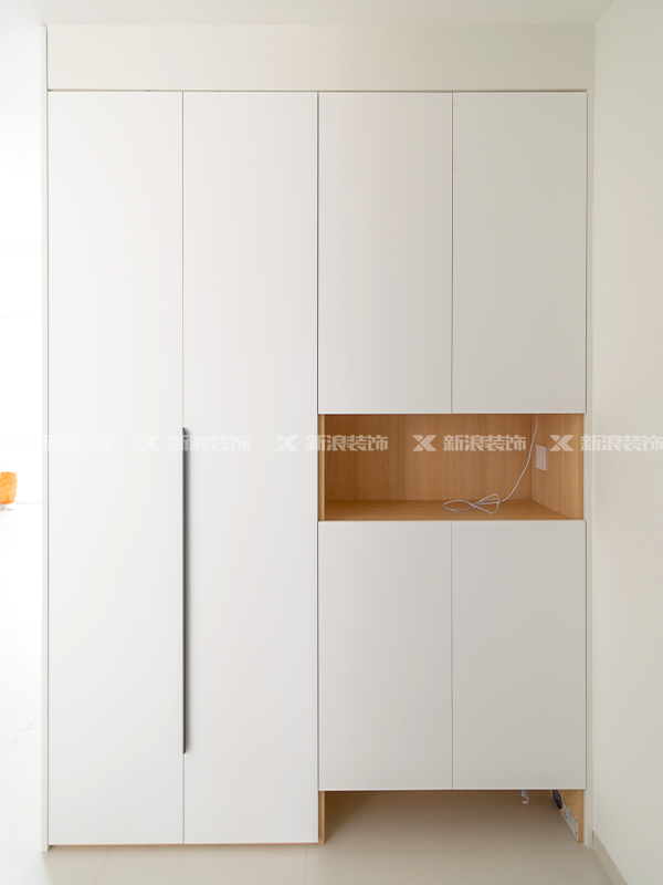 入戶玄關做開放小格,搭配旋轉鞋柜,轉角連接隱形門設計,搭配原木開放小格,提前預留電視機位置。