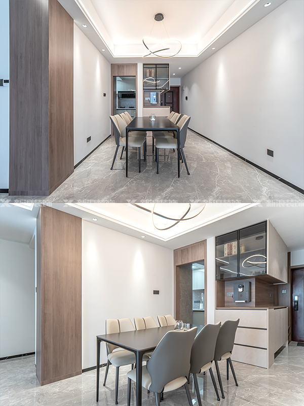 客餐廳吊頂一體,用線性燈延伸點綴,看起來真的很顯大!