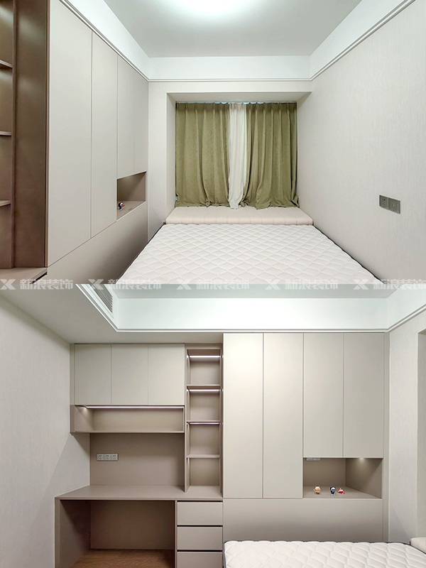 主臥室床頭位置做內嵌床頭柜,梳妝臺+轉角飄窗+書桌,增加儲物空間與臺面空間。
