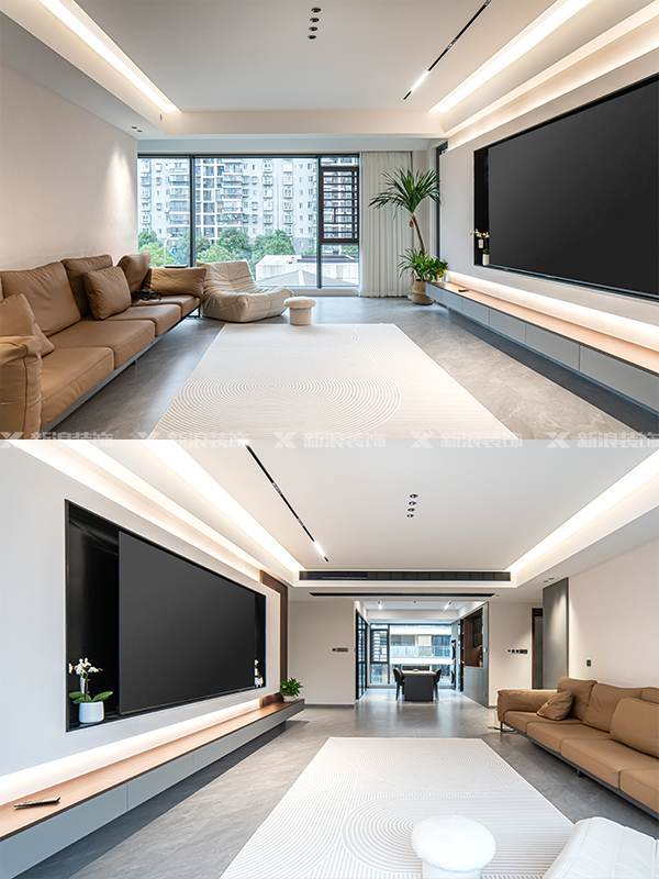 懸浮電視柜加上內嵌電視背景墻,連接走道收納柜,設計感十足