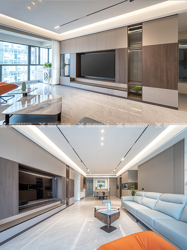 全屋地面采用700*1500亮面大磚通鋪,富有設(shè)計(jì)感的電視和沙發(fā)背景,收納和顏值兩不誤!