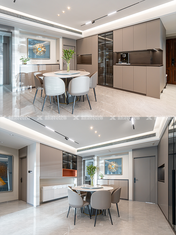 入戶位置做入戶鞋柜,活動(dòng)換鞋柜方便穿脫。轉(zhuǎn)角連接定制餐邊柜,空間連續(xù)有整體感。