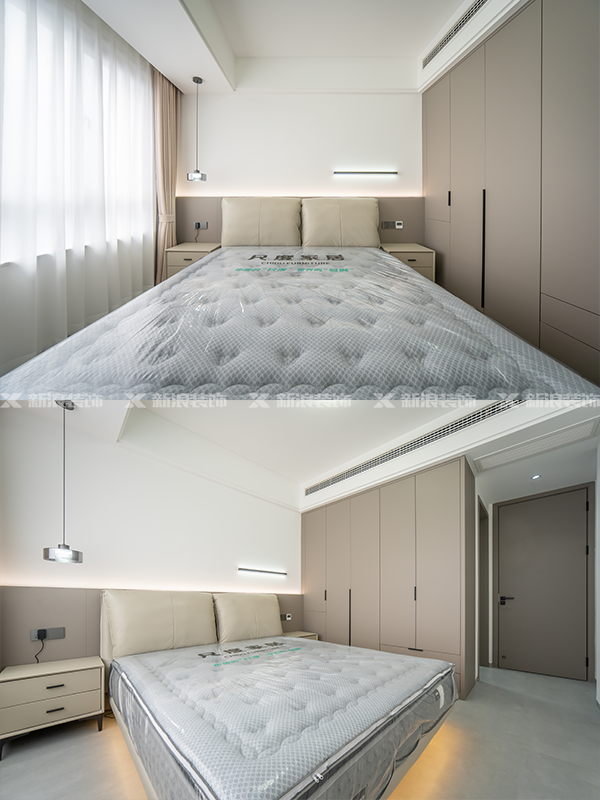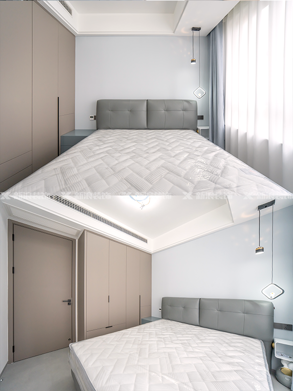 臥室做半墻床頭背景,打造高級感。滿墻一門到頂定制衣柜,穿插外露抽屜,打破沉悶,收納方便