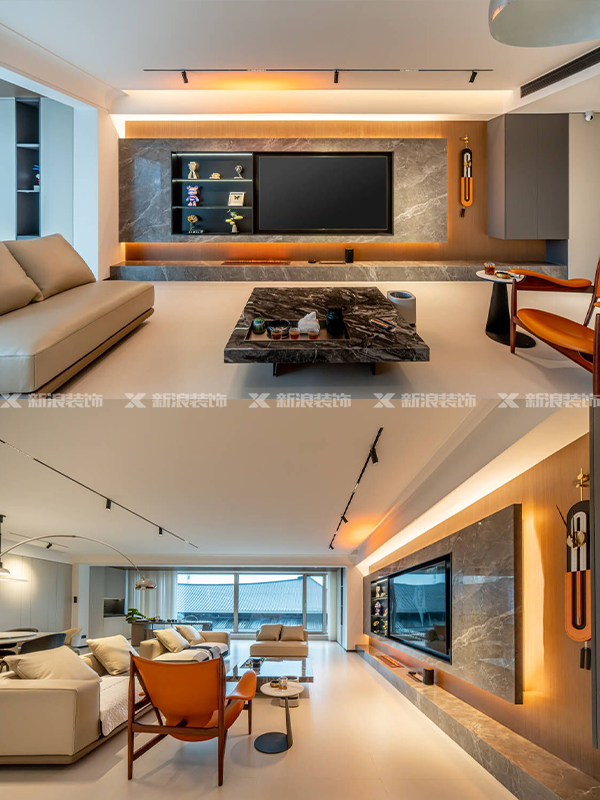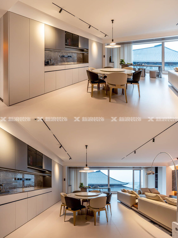 客餐廳空間開闊大氣,搭配木飾面巖板背景墻及極簡無拉手柜門,整體空間實用+美觀兼具