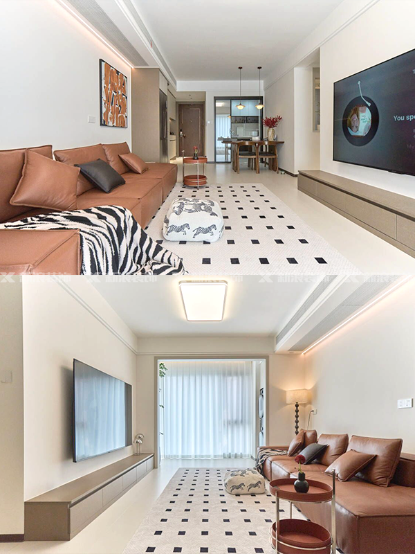 全房通鋪柔光大磚,同色美縫打造細膩質感??蛷d做風管機,簡約雙眼皮邊吊,搭配大吸頂主燈,空間顯大不壓抑!