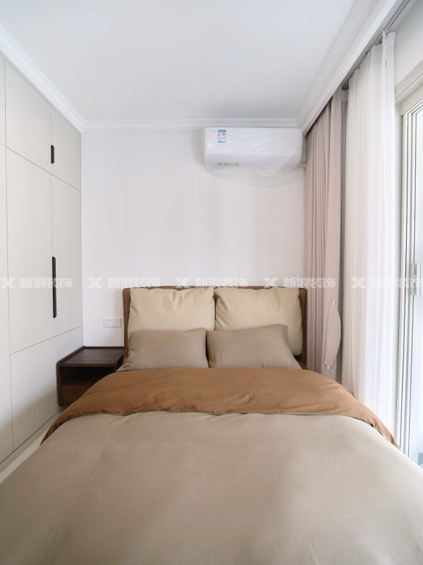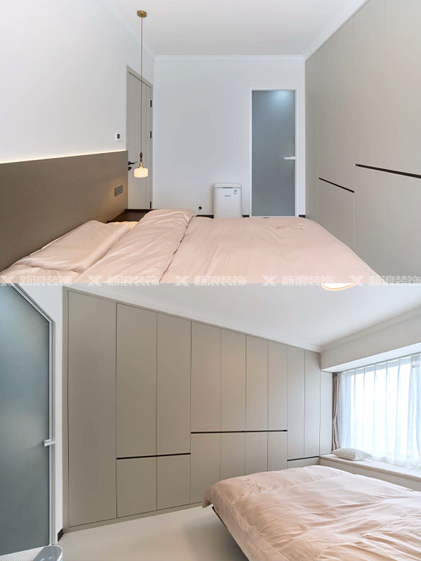 主臥充分利用空間,在床尾做整墻一門到頂衣柜,衣服、被褥都有地方收納,并且做免打手分段設計,防止磕碰!