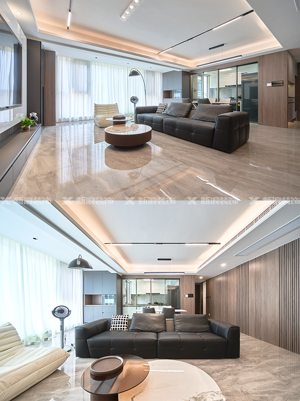 電視背景做巖板設計,電視內嵌,條柜做灰色調色搭配木紋色,輕奢感滿滿