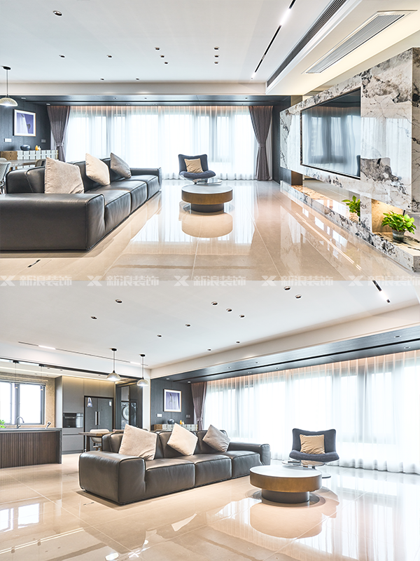 現代簡潔的造型電視背景,水墨般的巖板造型,和整體奶咖系配合,明亮寬敞。