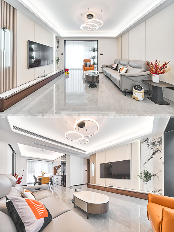 沙發(fā)背景和電視背景互相呼應(yīng),做同色設(shè)計(jì),格柵+巖板進(jìn)行局部點(diǎn)綴,增添亮點(diǎn)