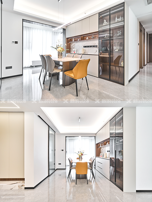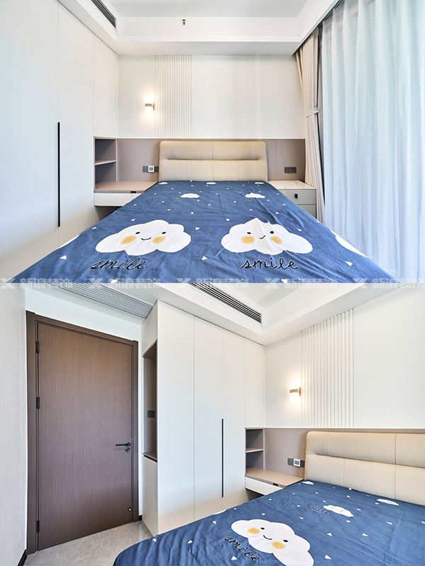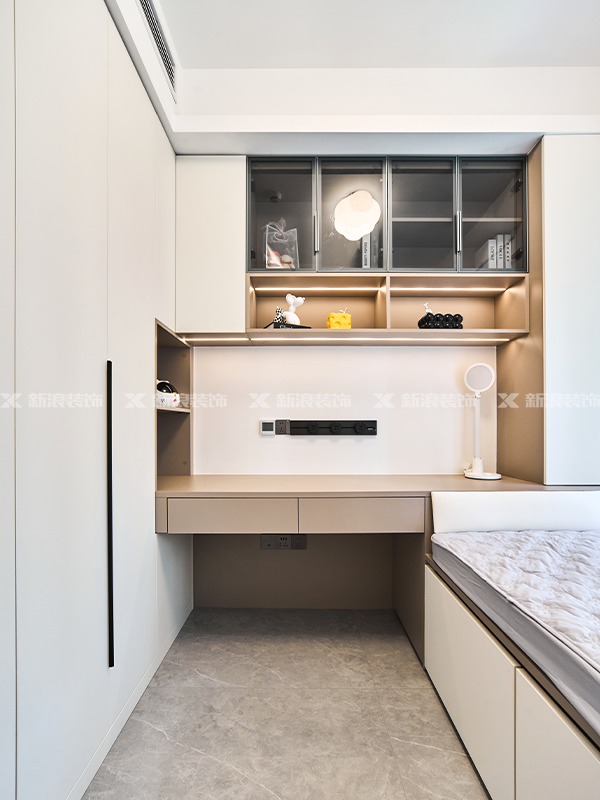 顏色偏淺調(diào),配合氛圍燈的設(shè)計(jì),滿(mǎn)足收納空間的同時(shí),讓空間最大視角延伸感