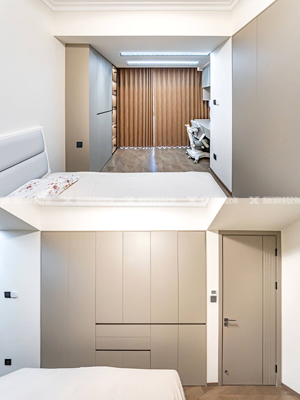 高端全屋定制:柜體板材為十環認證的萬象天冠18mm厚杉木芯板、歐松板膚感柜門、五金標配奧地利進口百隆一字鉸鏈、圓弧工藝、標配18mm背板+通體型材拉手。