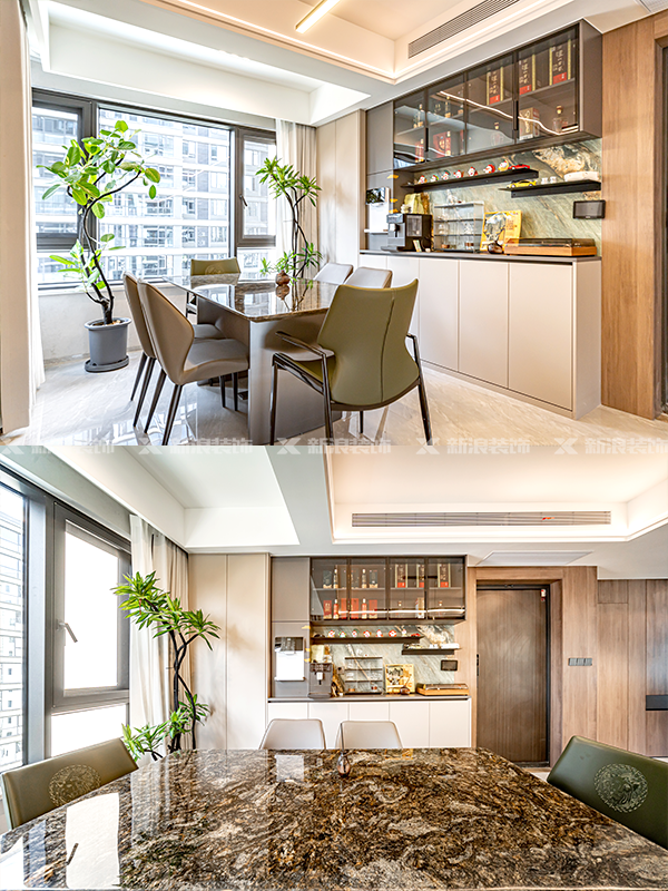 ?暗綠色奢華巖板裝飾,和餐邊柜互相呼應(yīng),打造低調(diào)的奢華視覺享受。