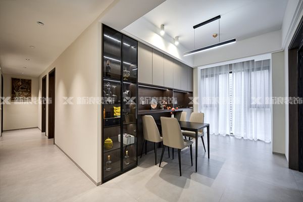 餐廳內(nèi)嵌餐邊柜搭配玻璃展示柜,餐桌椅選用同色系極簡造型。