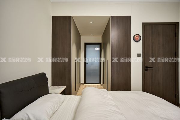 臥室大白墻延續(xù)極簡風(fēng)格,衛(wèi)生間通道兩側(cè)到頂衣柜做衣帽間,暖色燈光搭配木紋地板營造溫馨氛圍。