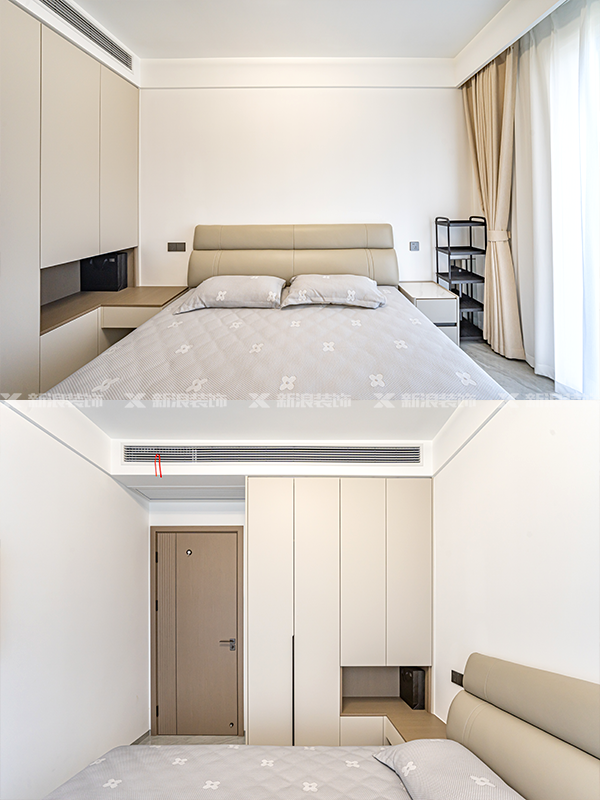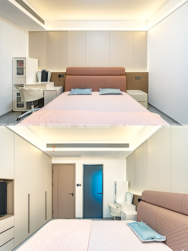 臥室整墻衣柜,一門(mén)到頂和分段相結(jié)合,適配多種收納需求。