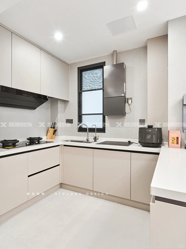客餐廳做懸浮無主燈吊頂,空間延展又開闊。廚房打通做開放式,保留半墻隔斷做補充臺面,操作空間超大。