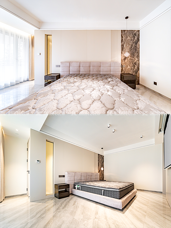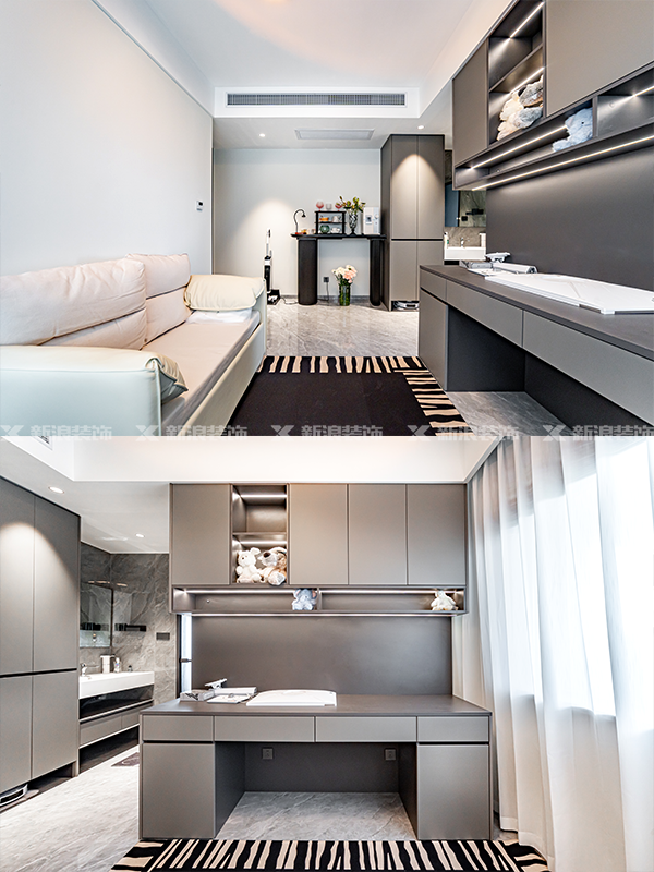 主臥做套房設計,利用衣帽間做隔墻,一邊做隱藏投影,穿插式一字型梳妝臺。