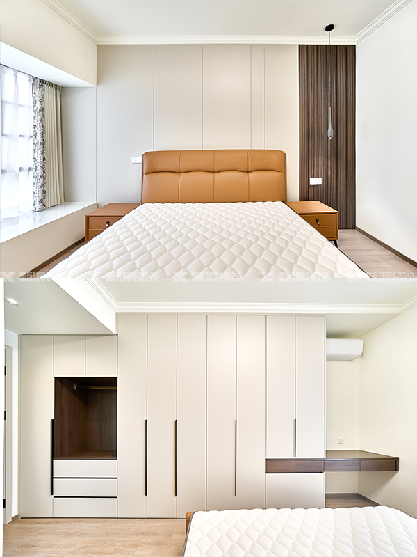 主臥的床尾位置做整墻衣柜,鏤空的掛取區可以掛取日常衣物。穿插式的設計做梳妝臺,滿足了主人日常的各種需求。