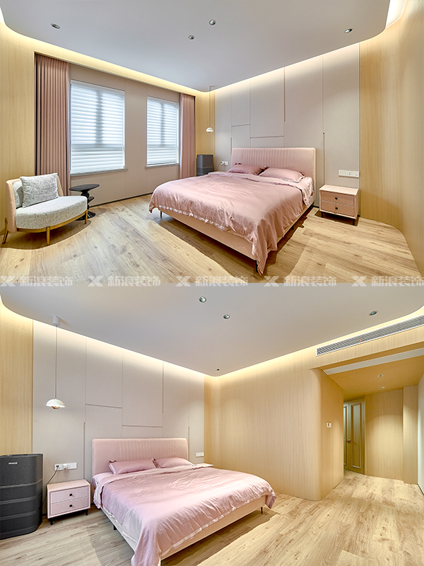 臥室軟包、木皮等材質上墻,呈現出豐富的層次感,將藝術與功能轉化為精致的細節,營造出靜謐舒適的休憩氛圍。陽光透過建筑灑入室內,帶來溫柔與浪漫之感。