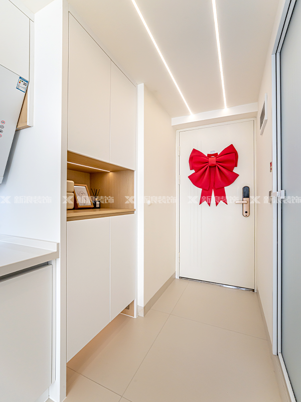 進門一字型經(jīng)典結(jié)構(gòu),入戶鞋柜、廚房、洗手間在兩側(cè)一字排開。