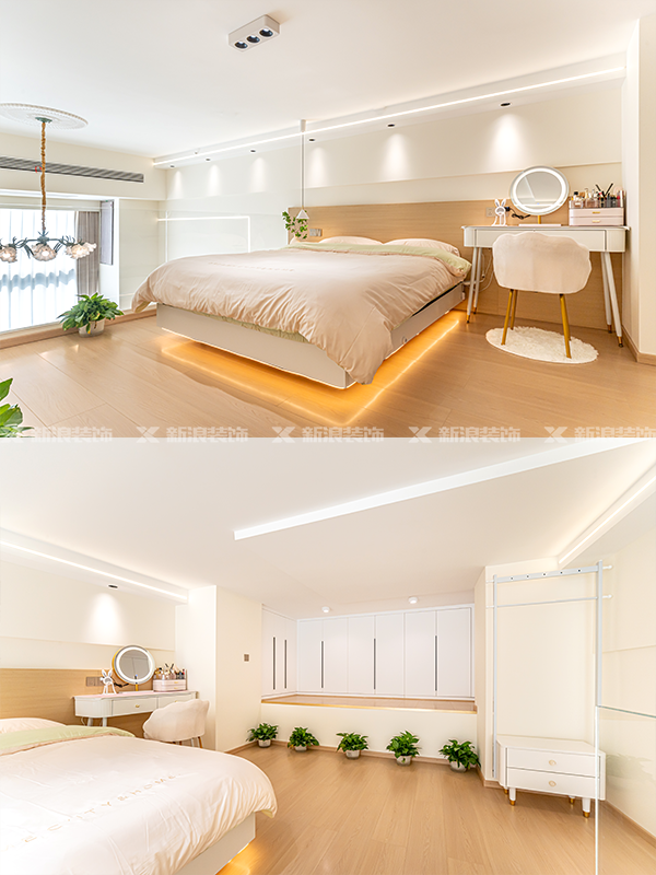 原木色床頭給房間增添幾分溫暖,全房4000k的色溫照亮家里的每一處黑暗。