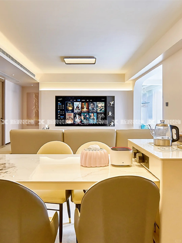 新浪裝飾,極刻美家,客廳滿墻電視柜,長沙裝修,麗爾曼頓,充滿設計感的電視柜,圓弧包柱,高端全屋定制工廠,現代輕奢裝修,精裝房設計,家居家裝日常