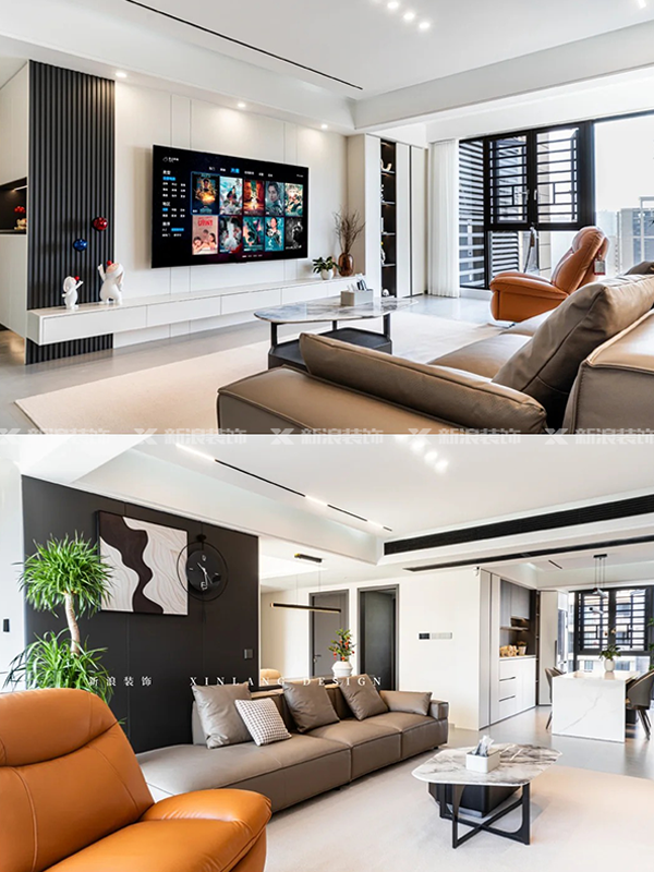 整體用簡約的線條搭配暖棕色家居軟裝,為冷硬的空間增添溫暖舒適。