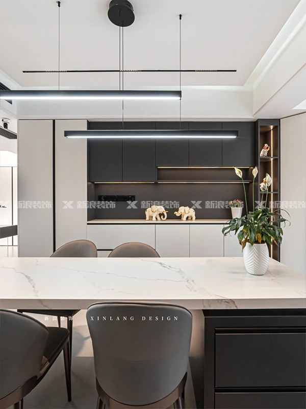 餐廚部分做一體設計,開放式廚房動線明晰,冰箱外置嵌入餐邊柜,操作方便。