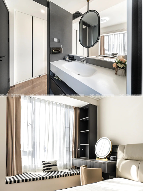 主臥做半開放式套間設計,洗漱干區+梳妝臺一體設計,加上床尾滿墻衣柜,空間充分利用!
