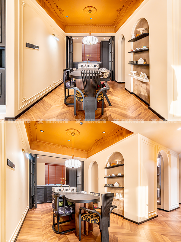 法式石膏線條裝飾墻面和頂面,搭配圓弧門洞、裝飾層板、裝飾壁爐、羅馬柱等,每一個(gè)細(xì)節(jié)都彰顯著法式復(fù)古的獨(dú)特魅力。通鋪的魚骨紋木地板更是為整個(gè)空間增添了一份優(yōu)雅與質(zhì)感。