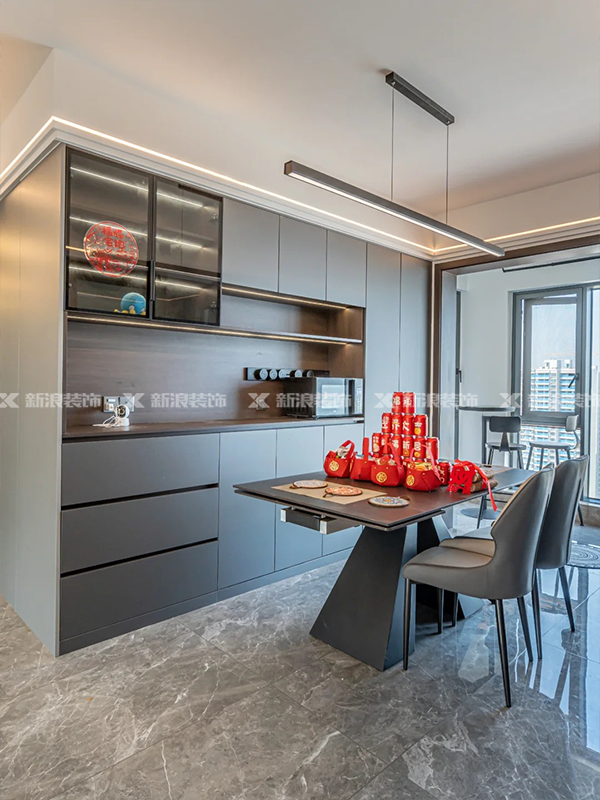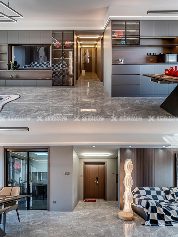 新浪裝飾,麗爾曼頓,長沙裝修,實景落地,現代風格設計,裝修實景案例,裝修風格,客餐廳一體化,暗黑色裝修,毛坯裝修