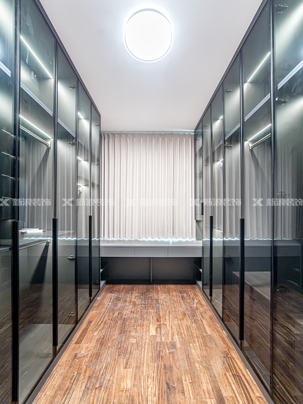 主臥擯棄轉交衣帽間,采取床尾柜更加大氣,背景墻也有增加氛圍感、整體感的作用。衣帽間的鍍膜玻璃,也可以讓我們避免鏡子小的尷尬處境!