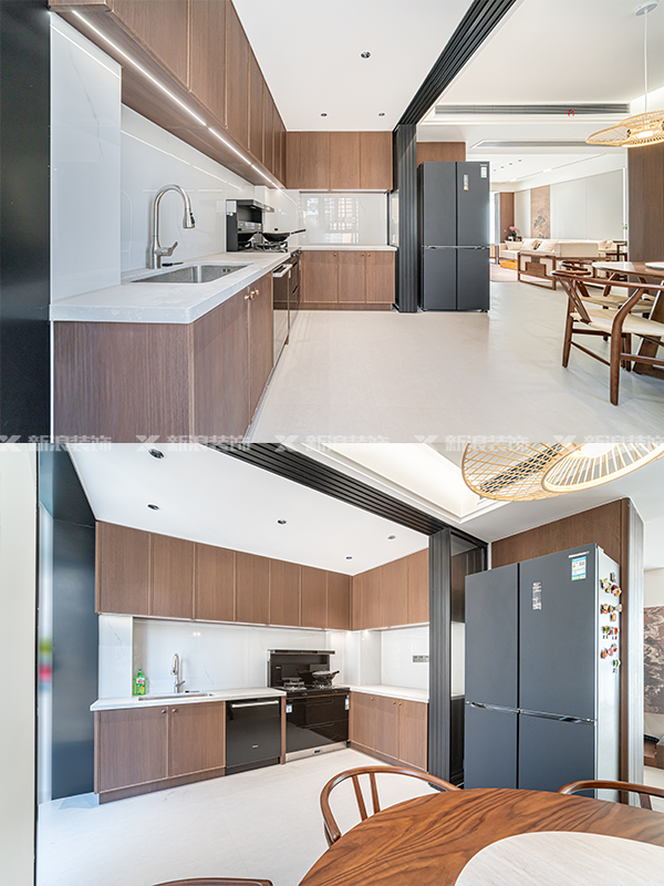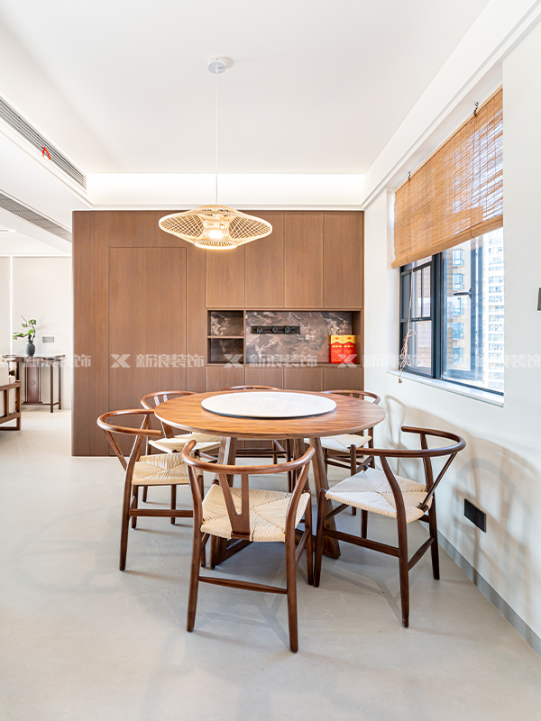 餐廚一體化,開放式廚房搭配圓桌,動線流暢,空間也開闊超多。竹編吊燈搭配竹卷簾,新中式的韻味算是被徹底拿捏啦!