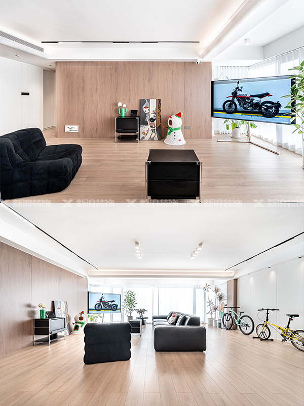 全屋地面采用木地板369通鋪,腳感舒適,視覺上也和木色墻板達成統一。