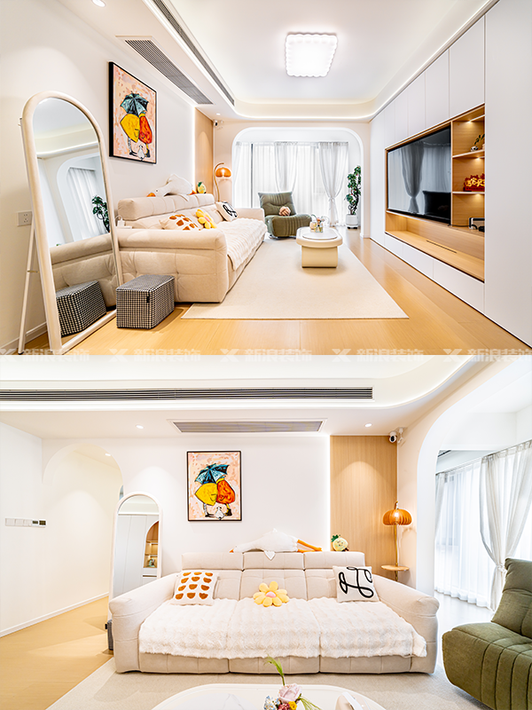 全房軟裝用色彩鮮艷有趣的掛畫、綠植、擺件點綴,奶油色布藝沙發,下班只想窩進去躺個夠~