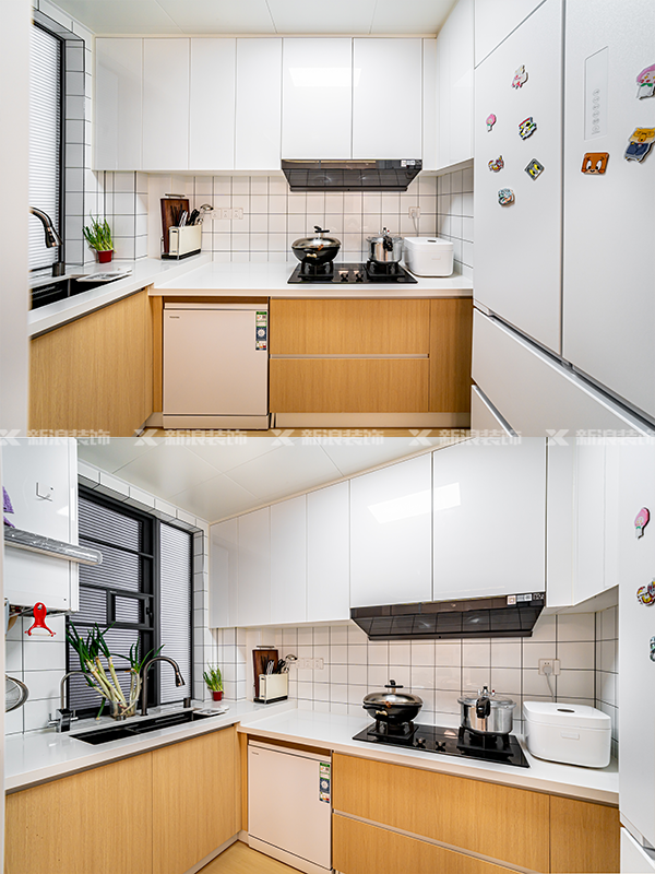 全屋定制配色用朗秋原木色搭配琥珀白,免拉手分段設計,簡約又舒適。