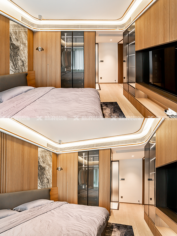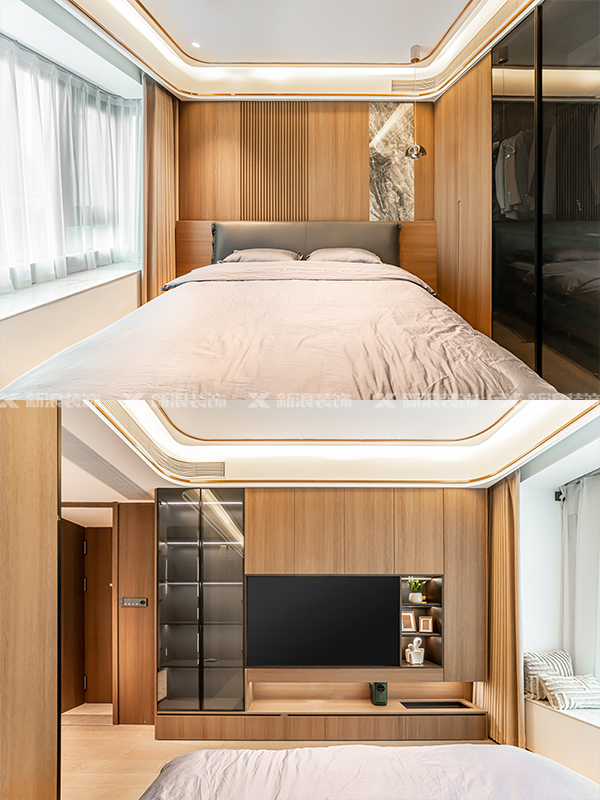全屋定制一體化設計,床頭木飾面硬包搭配吊頂香檳金線條,高級感瞬間拉滿!