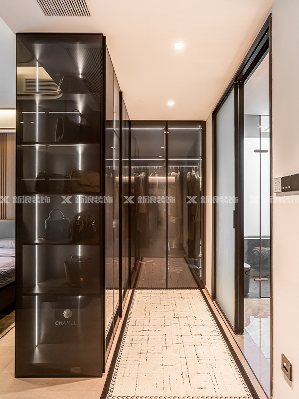 衣帽間柜門采用夾紗工藝玻璃和紗線交織,衣物在光影中若隱若現,飄逸又修長,簡直是時尚達人的最愛!