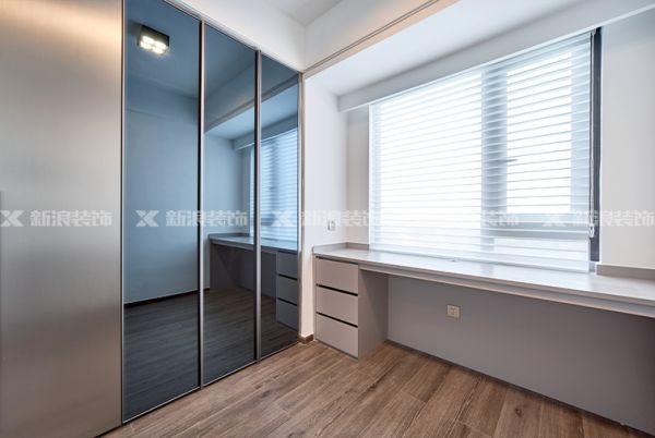 衣帽間做L型衣柜+一門到頂設計,三面柜門做落地穿衣鏡功能性十足。