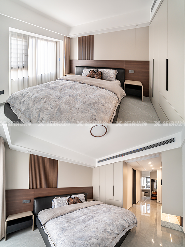 隱形收納:榆木定制柜嵌入墻體,門板一板到頂,極簡無把手設(shè)計(jì)。