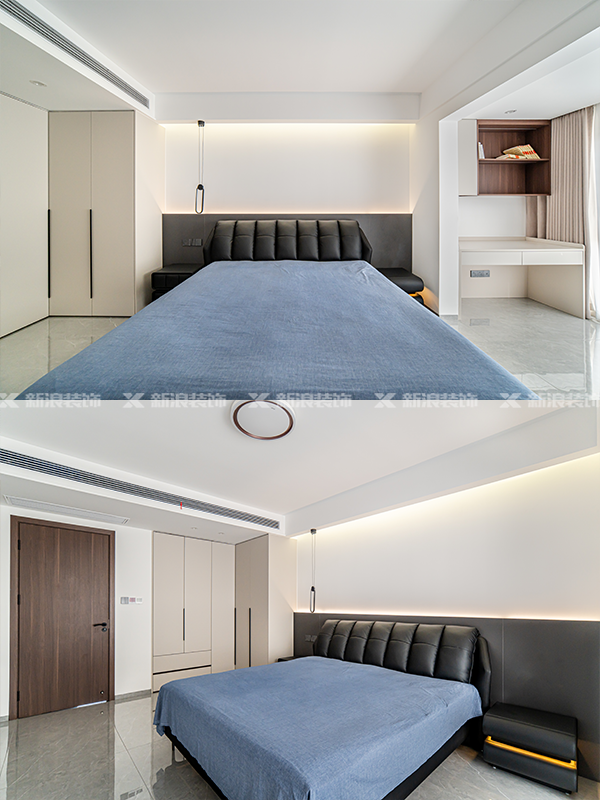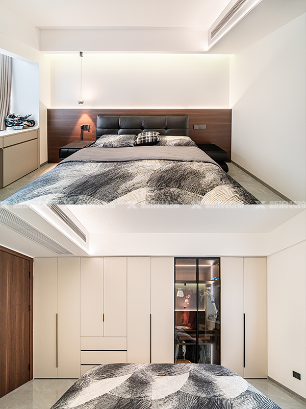 墻面通刷象牙白,大磚通鋪加上無主燈設(shè)計(jì),營(yíng)造「懸浮感+呼吸感」兼具的視覺層次。