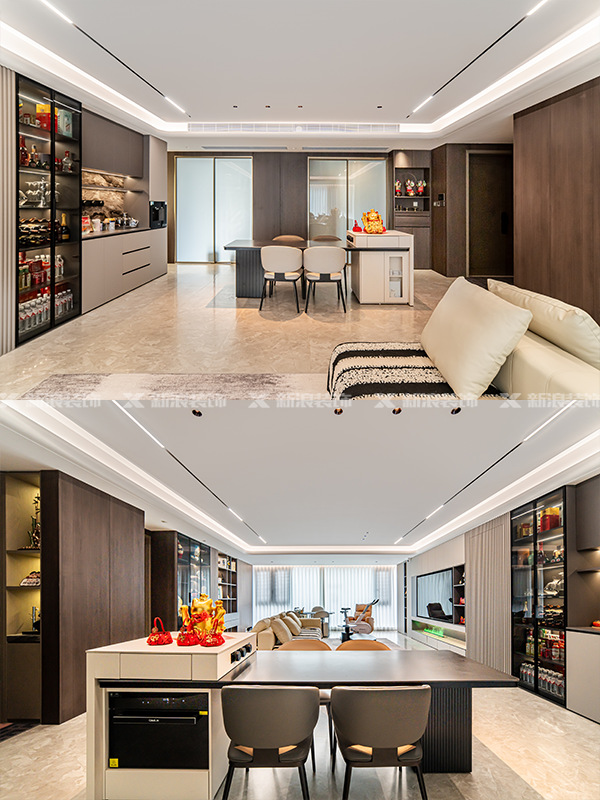 簡(jiǎn)約、線條明晰的白棕撞色,亮面750*1500大磚通鋪,通透明亮。