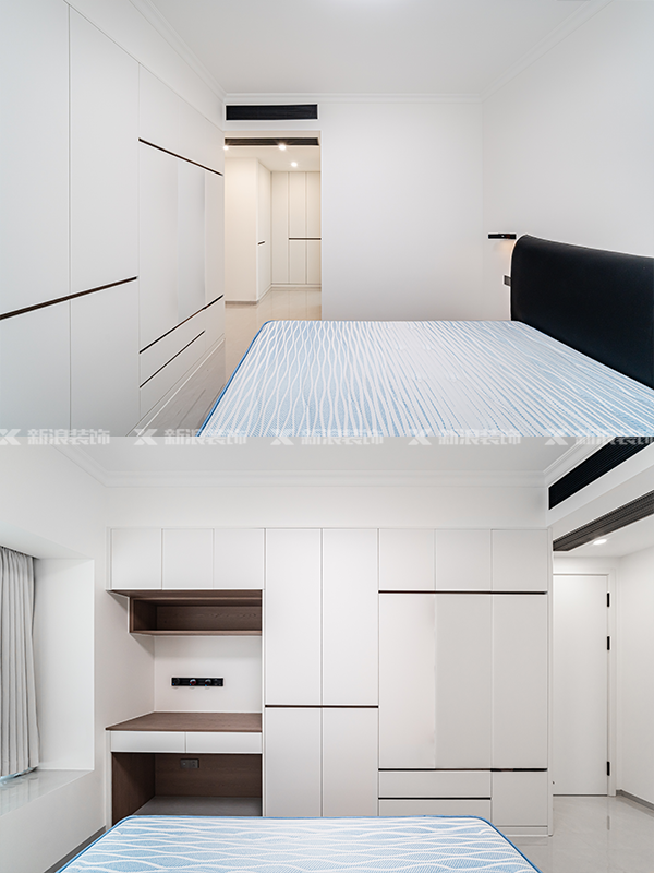 ·主臥衣柜分段搭配鏤空書桌梳妝臺,,空間利用率超高的。臥室不做復(fù)雜設(shè)計,回歸最原始的休息功能。