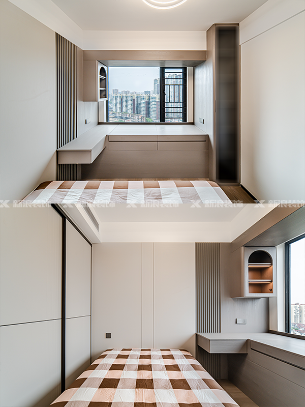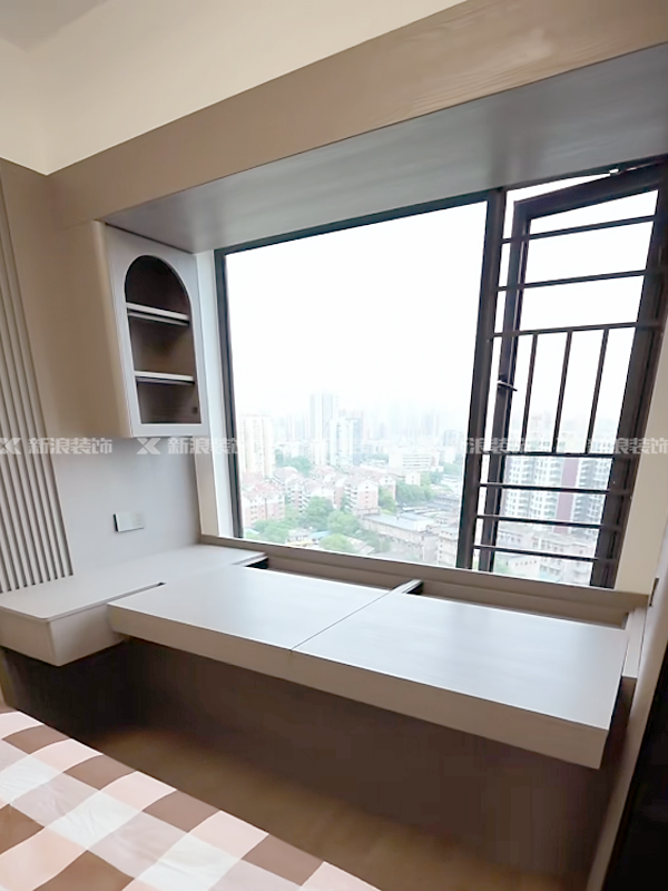 飄窗利用的好,一次性擁有書桌、梳妝臺和儲物柜~