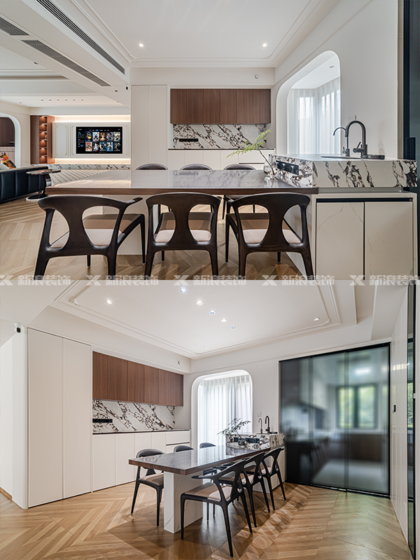 餐廳餐島臺:大理石臺面搭配胡桃木柜體和黑色金屬元素,精致又實用!早餐臺、收納柜、社交區三合一,誰看了不夸一句高級感爆棚