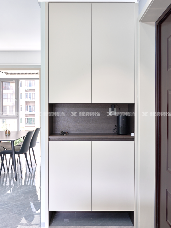 門墻柜一體,采用煙熏尤加利+象牙灰配色,經典又耐看;